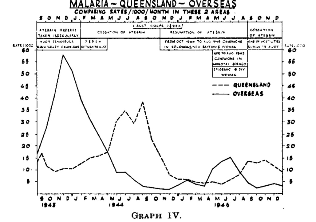 Allied armies were particularly challenged by malaria infections during World War II, particularly in soldiers deployed in Africa, India and the Pacific Islands. Malaria casualties were of utmost concern in the Southwest Pacific theatre as entire infantry divisions required months after deployment on Pacific Islands to rehabilitate in non-malarious areas during multiple bouts of relapsing malaria.9 The extraordinary frequency of malaria relapses, often exceeding 10 in a single soldier, raised questions about why this was so different from prewar medical experience. Although imperfect chemosuppression, frequency of infection and wartime conditions likely explained much of the increased malaria incidence, there were attempts to blame the victim.10 Alcoholic excess has been blamed as the cause of many soldiers’ shortcomings, including malaria, especially when the analogy from the drunken colonial plantation owner was carried over into the military.