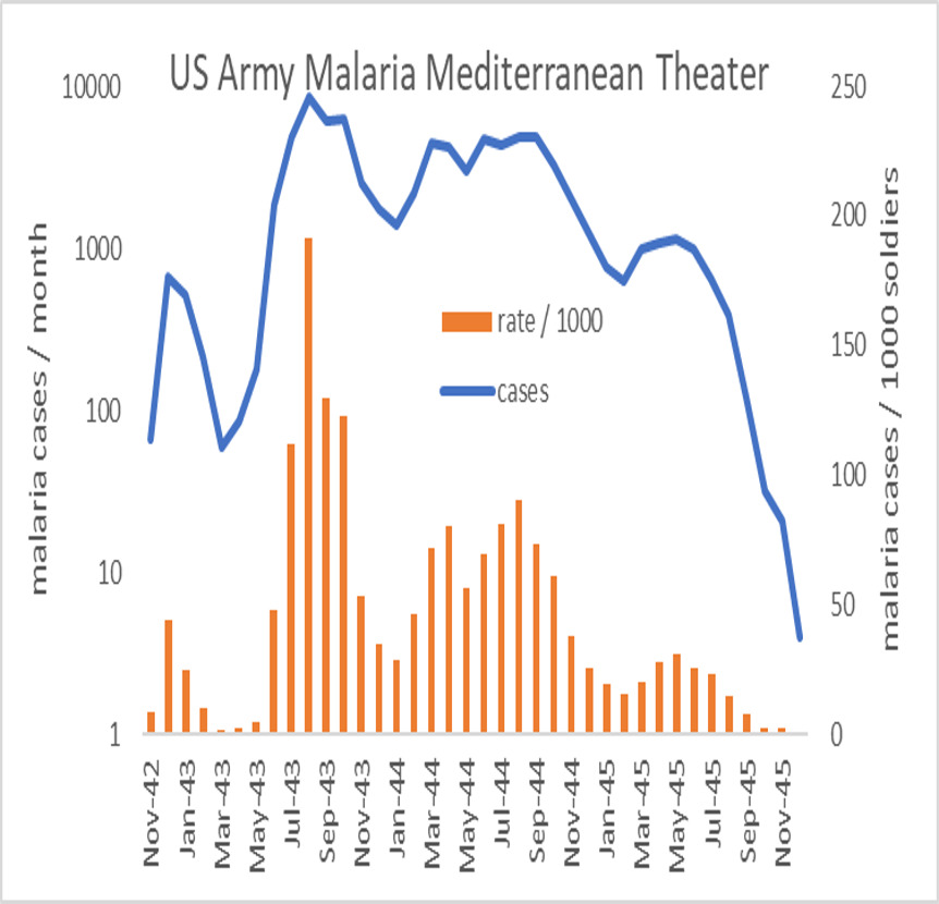 An analogous situation existed with the US Army fighting in North Africa and Italy. By 1945, many soldiers still had residual parasites in their livers from previous infections, which were largely suppressed by daily mepacrine as the war moved further north into Europe. Alcohol was certainly more available in Europe than in the Pacific Theater. This was particularly true when the armed conflict ended in May 1945. The end of World War II in Europe resulted in much Allied rejoicing and alcohol bingeing. Many US soldiers did not remember much about the Victory in Europe (VE) celebrations other than the huge hangover afterwards. Figure 3 shows the overall malaria epidemiology for the Mediterranean Theater for the US Army.16 There is no evidence of any increase in malaria associated with VE Day, but neither was there any removal of chemosuppression as had occurred in Australia. Therefore, there is no population-based data to indicate that alcohol ingestion promoted P. vivax relapse in either the Australian or US Armies of World War II. However, the data are insufficiently granular to rule out such an effect in some individuals.