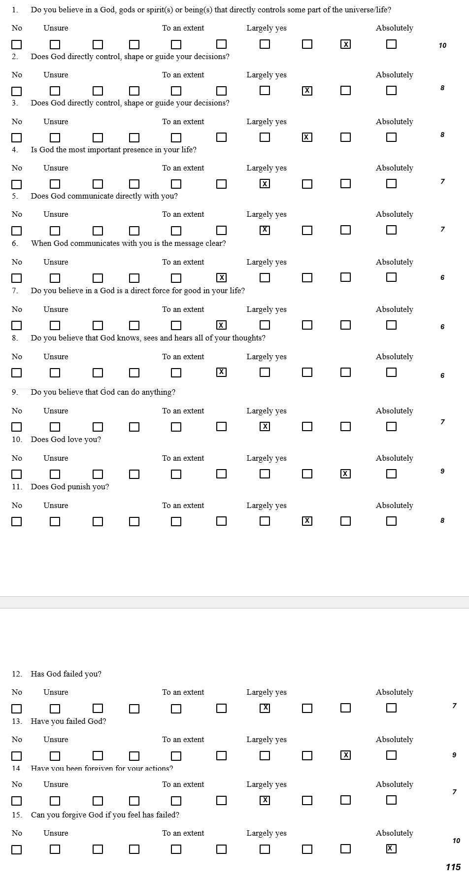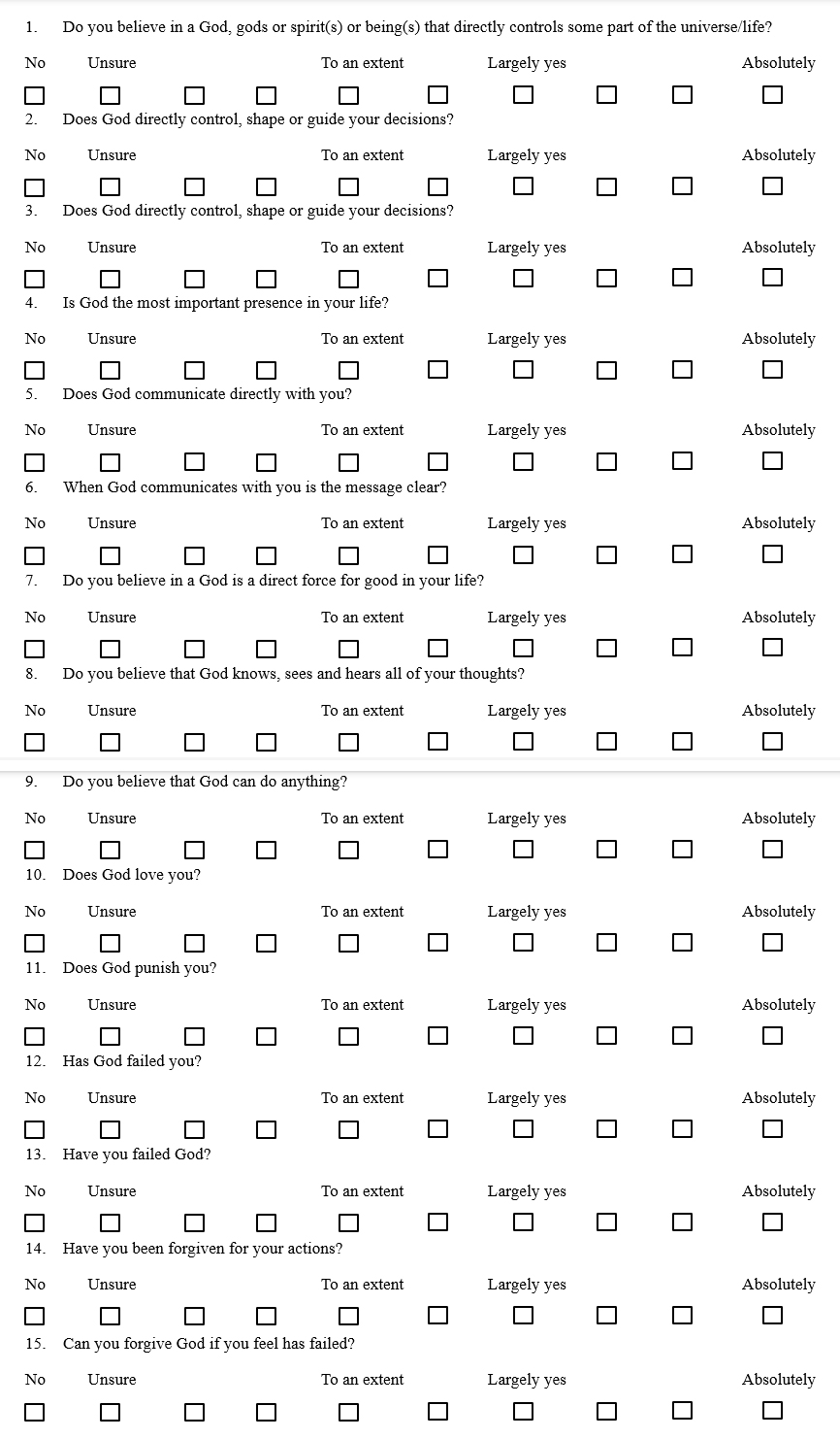 | Spiritual Assessment Inventory | A 49-item measure of spirituality with five factors: Awareness of God (19 items), disappointment in relationship with God (7 items), realistic acceptance of God (7 items), Grandiosity in relationship with God (7 items), and instability in relationship with God (9 items). | 2002 | Todd Hall |