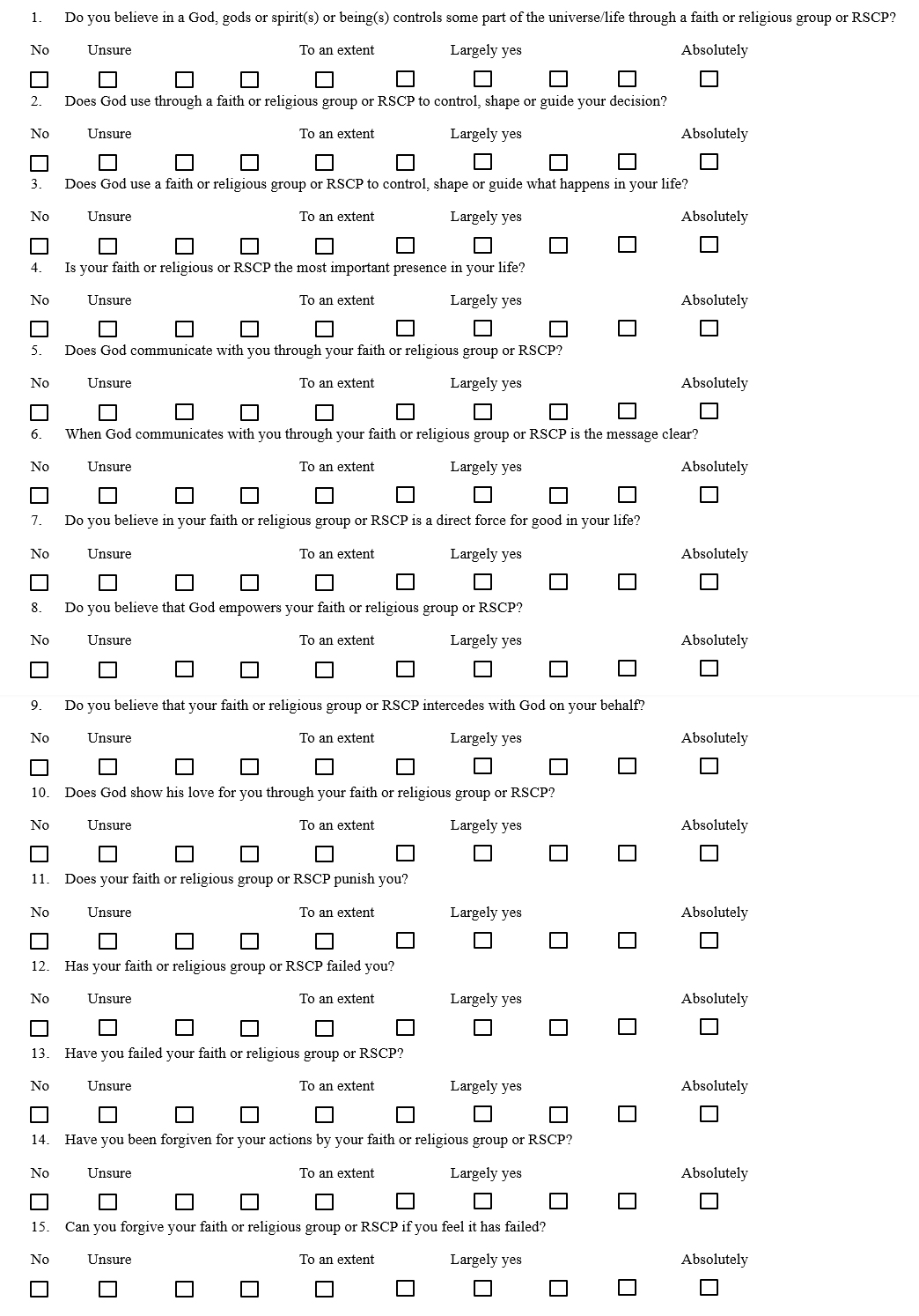 In both cases, the focus of the SW&I assessment does not refer to the validity of or the means through which the perception is formed. RSPs, regardless of their spiritual or religious affiliation, should initially seek to use spiritual assessment tools to understand the nature of the SW&I and not to proselytise for their religion. This may come later if the specific nature of the SW&I necessitates such action and if the individual requests it. Likewise, non-spiritual practitioners of every discipline must accept that some individuals have faith or spiritual beliefs and should not seek to question or alter this. A tool such as the SW&IAT-P seeks to understand the effects upon an individual’s spiritual health that may have occurred because of a TPE or traumatic event.