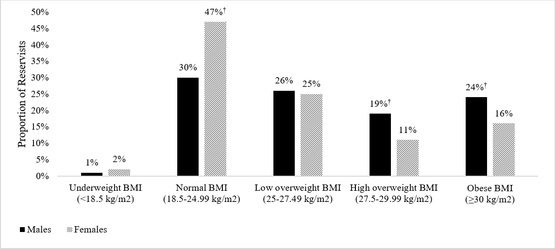†Indicates that the proportion of Reservists in the BMI category is higher compared to the proportion for the other sex (p<0.001).