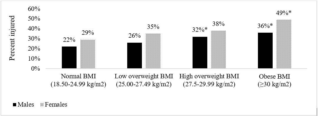*Indicates that the proportion of Reservists reporting at least one injury is higher than the proportion injured among those who reported normal BMI (p<0.05).