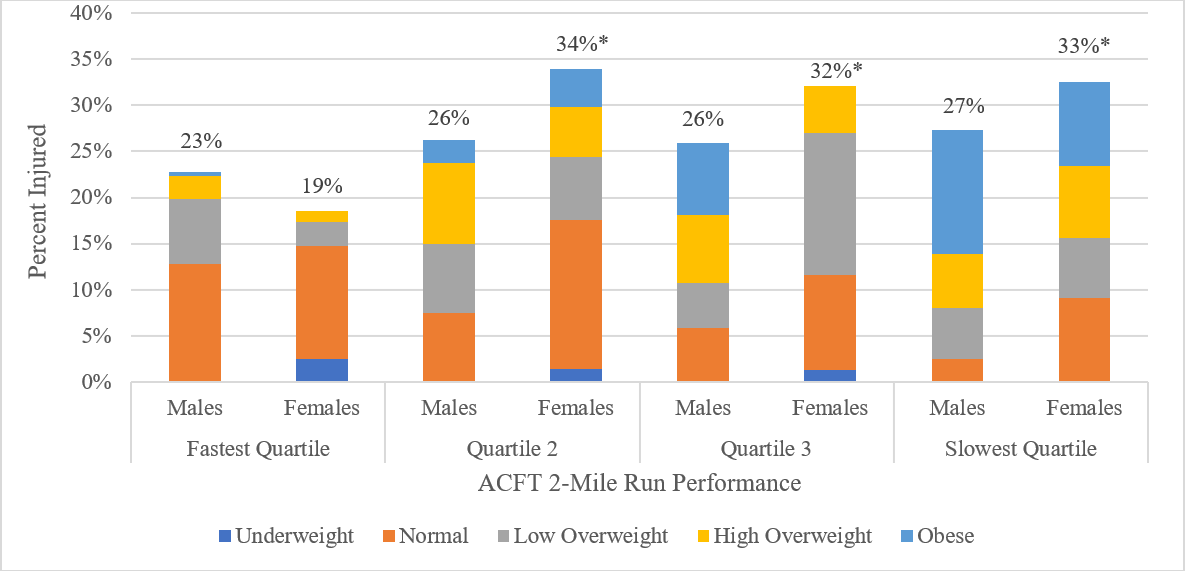 *Indicates that the proportion of Reservists reporting at least one injury is higher than the proportion injured among those with the fastest ACFT 2-mile run performance (p<0.05).
