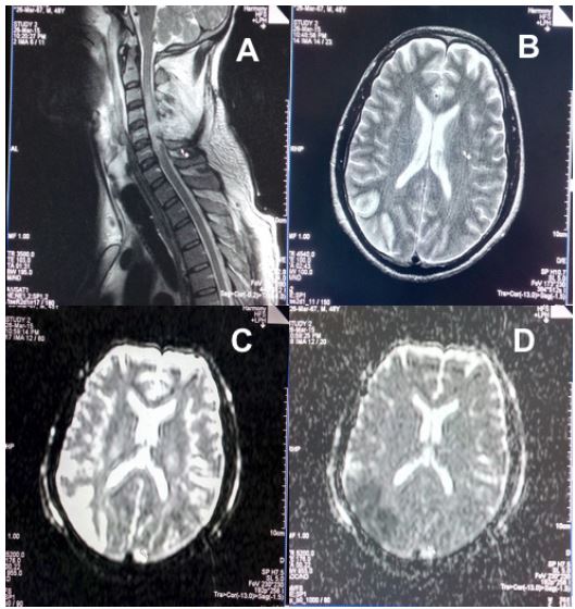 Fig 2 (Case 2: Gunshot wound Neck): Magnetic resonance revealing (A) Comminuted posterior fracture of C4 and C5, cord compression and edema extending from C3 to C6 vertebrae (B-D) Watershed infarct of right middle and posterior cerebral arteries, and occlusion of internal carotid artery.