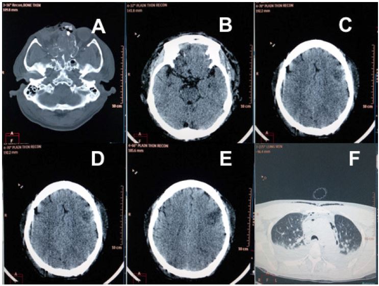 Fig 1 (Case 1: Gunshot wound Face): Non-contrast Computed tomography (NCCT) head revealing (A) Multiple skull fractures including fractures of maxillary antrum, nasal bone, ethmoid and sphenoid; (B and C) Cerebral contusions in bilateral basi-frontal, right anterior and high frontal lobes; (D and E) Contusion in left temporal and occipital lobes; (F) NCCT chest revealing bilateral pleural effusion, basal consolidation and pneumomediastinum.