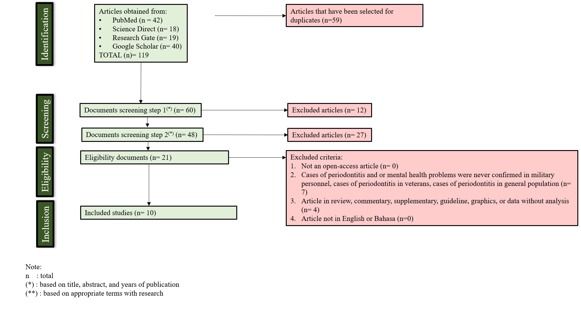 This review exclusively encompasses those that have been authored and published in the English language, adhering to specific inclusion criteria such as: 1) articles that were selected as observational studies (cohort, case control or cross-sectional), article reviews or case studies; 2) articles published in 2015–2025; 3) confirmed as periodontitis cases superimposed or overlap with mental health problems in military personnel. Exclusion criteria for selection were: 1) not an open-access article; 2) cases of periodontitis were never confirmed in military personnel; 3) article in commentary, supplementary, guideline, graphics, or data without analysis; 4) article not in English or Bahasa.