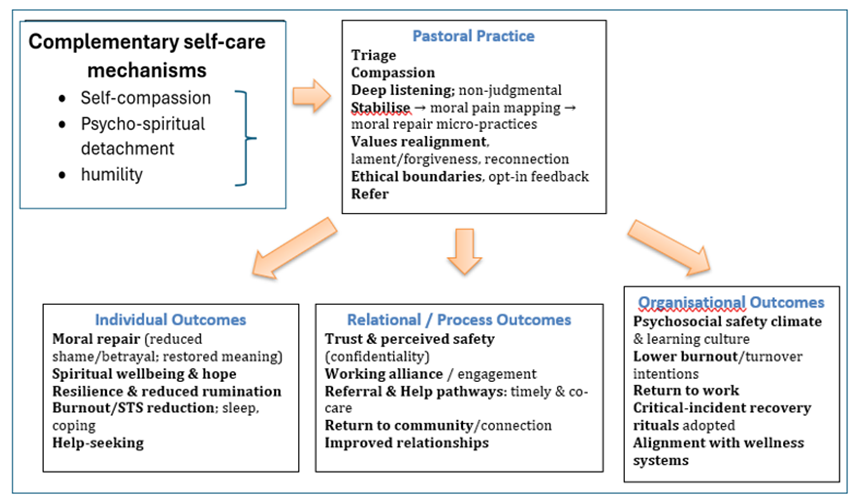 This aligns with the BPSS framework, which views organisational, relational and individual wellbeing are interconnected. From a pastoral perspective, humility, tender detachment and self-compassion become not only personal mechanisms but cultural resources that strengthen collective resilience.
