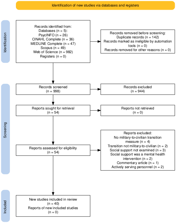 This scoping review followed the Joanna Briggs Institute (JBI) framework for scoping reviews25 and is reported in line with the Preferred Reporting Items for Systematic Reviews and Meta-Analyses extension for Scoping Reviews (PRISMA-ScR26). Searches were conducted on 28 April, 2025, across five electronic databases: APA PsycINFO, CINAHL Complete, MEDLINE Complete, Web of Science and Scopus, with no date restrictions. Key concepts searched were ‘veterans’, ‘social support’ and the ‘military-to-civilian transition’ in the titles and abstracts of articles from each database. The search terms for each concept were combined using the Boolean operator ‘AND’. The complete search strategy for the included databases is presented in Table 1.