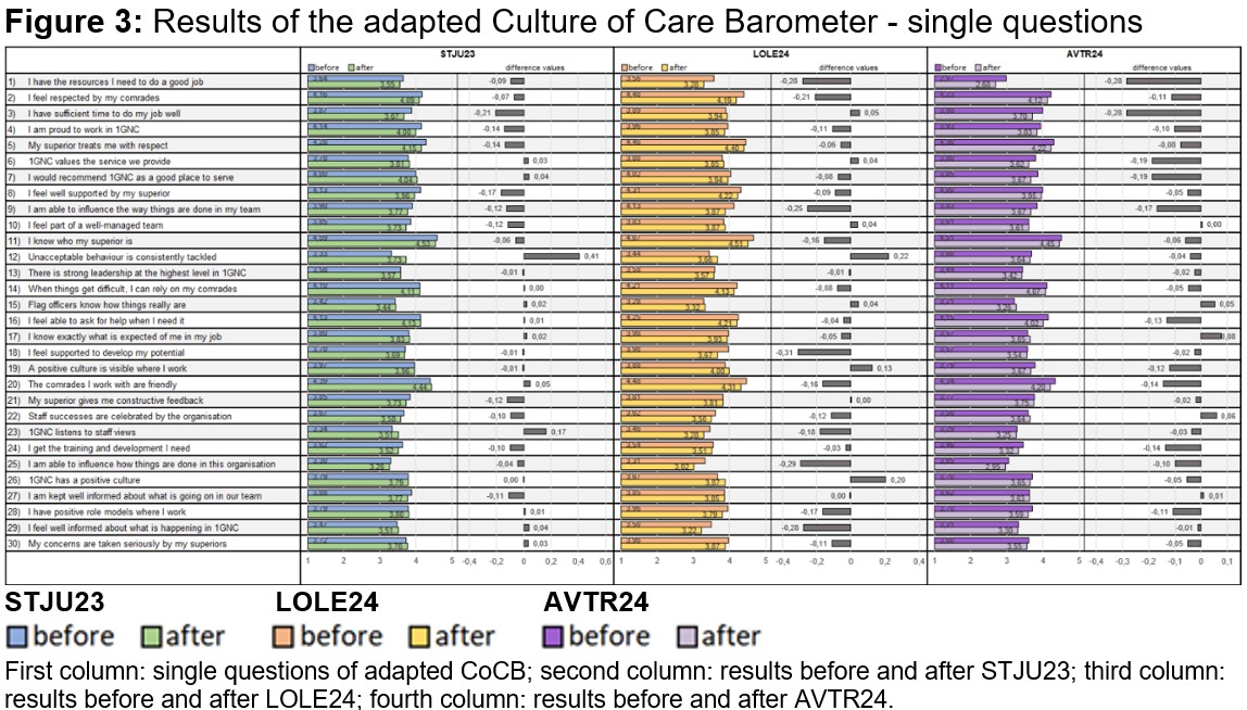 This study is conceived as an anonymised, observational cohort study. During the command-post exercises STJU23, LOLE24 and AVTR24, the soldiers of the 1GNC were interviewed before and after each exercise. The adapted ‘Culture of Care Barometer’ was used as a measuring instrument to investigate the workplace-related strengths and weaknesses of 1GNC.